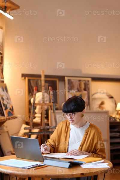 Художница, использующая ноутбук в художественной студии Женщина-художник управляет малым бизнесом