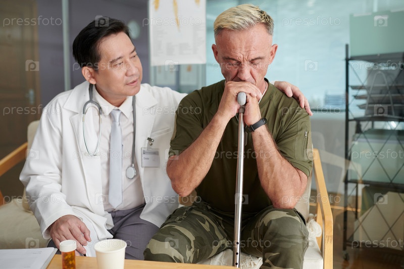 Врач поддерживает солдата в его реабилитации
