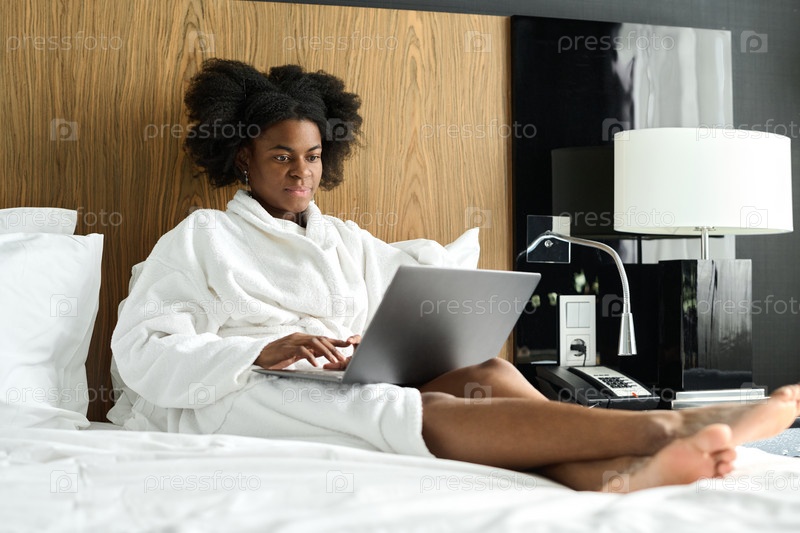 Женщина, использующая ноутбук, расслабляется на кровати
