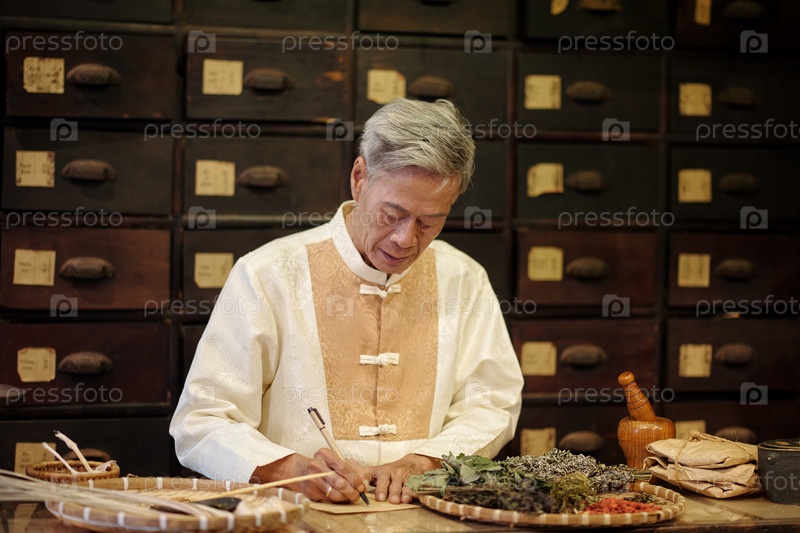 Работник аптеки составляет список трав для традиционной азиатской медицины