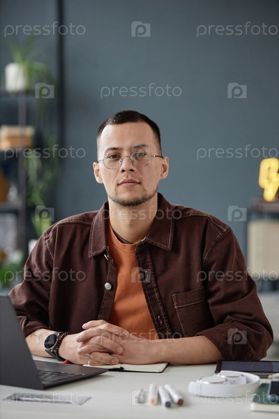 Азиатский мужчина сидит на рабочем месте в офисе