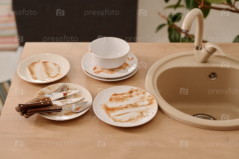 Грязная посуда на кухонном столе у раковины
