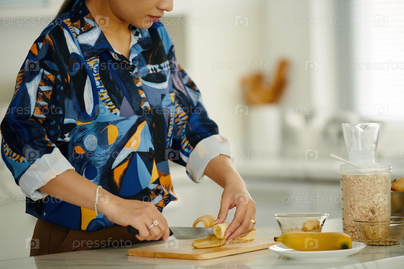 Домашняя хозяйка режет банан на завтрак