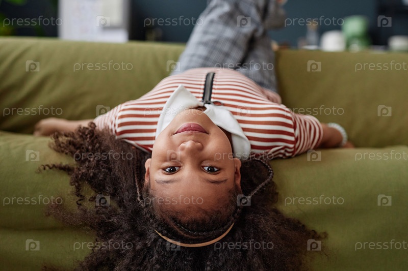 Черная девочка, лежащая вверх ногами на диване