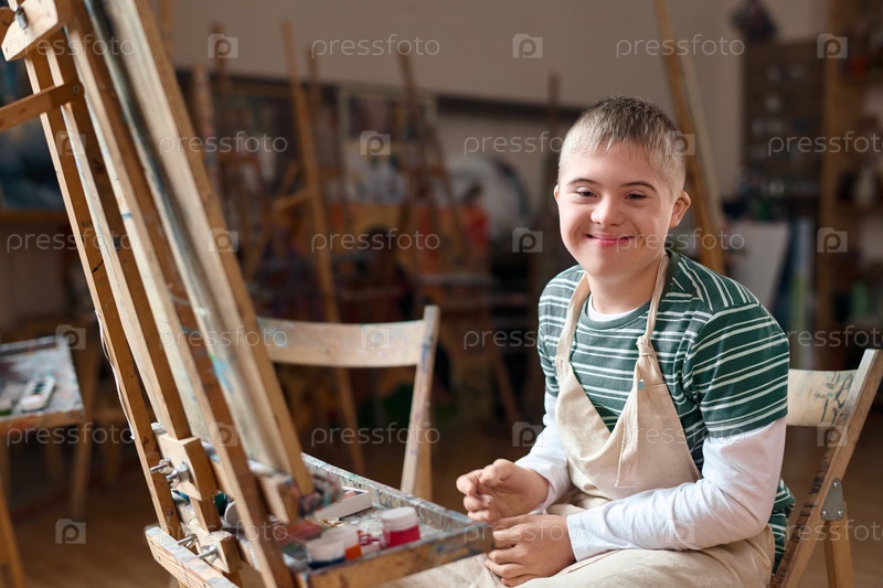 Мальчик с синдромом Дауна улыбается камере на уроке искусства