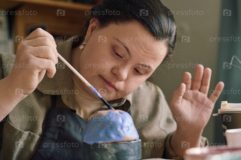 Женщина с синдромом Дауна окрашивает керамическую чашу
