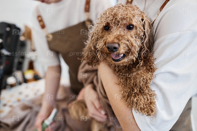 Груммер, держащий счастливого мокрого пса