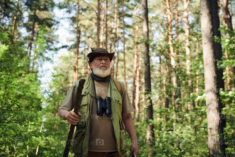 Бородатый человек ходит по лесу