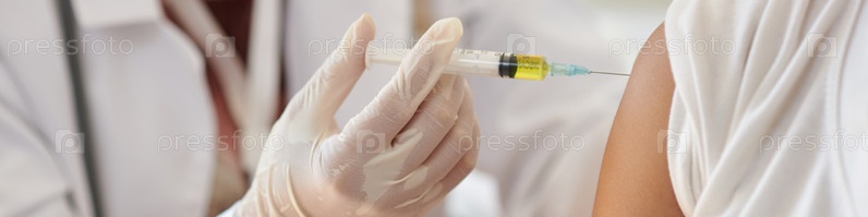 Врач вводит вакцину в руку пациента