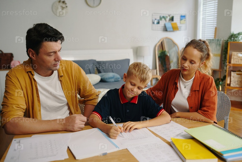 Родители делают домашнее задание с сыном