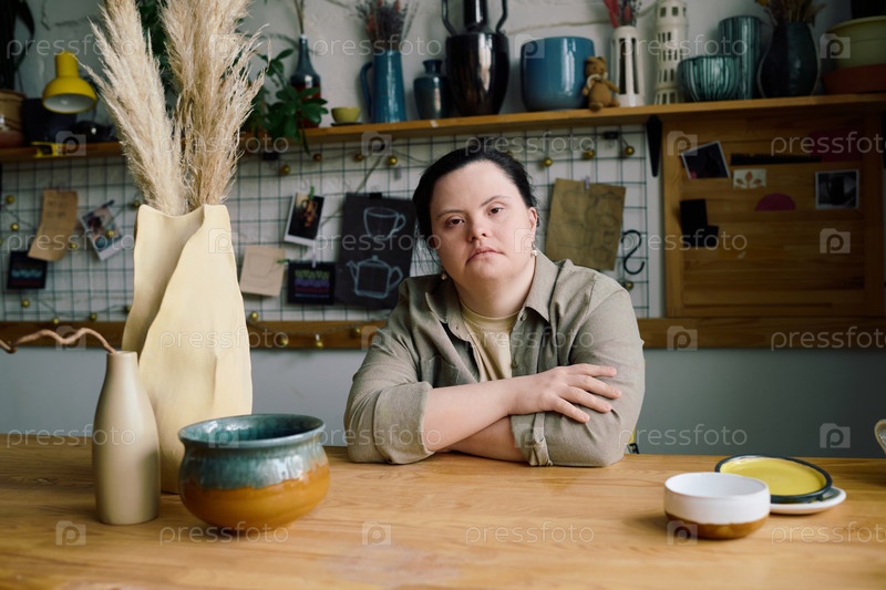 Молодая женщина с синдромом Дауна сидит за столом