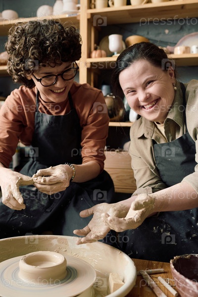 Веселые разнообразные женщины во время урока керамики
