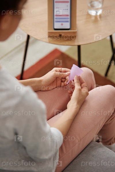 Женщина, держащая менструальную чашку дома