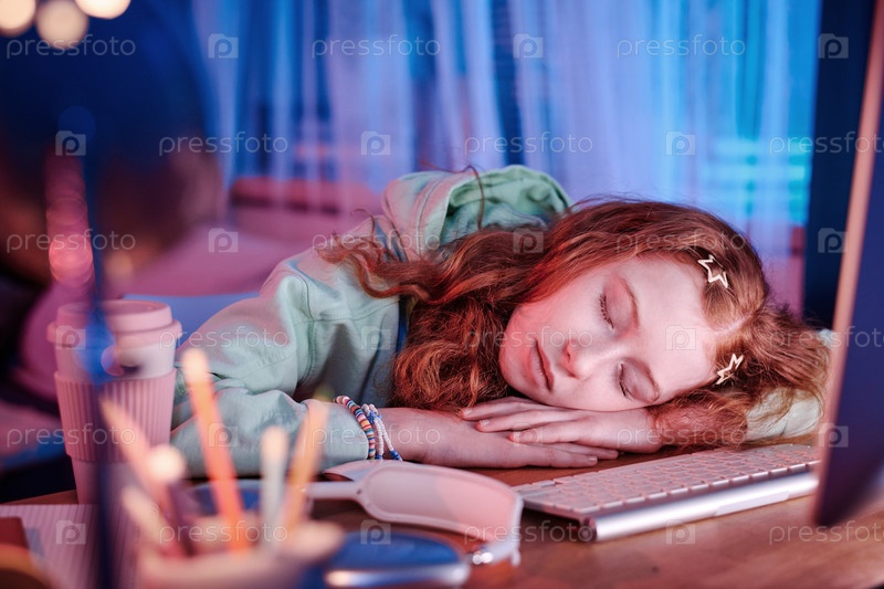 Усталая девушка спит на столе в своей комнате