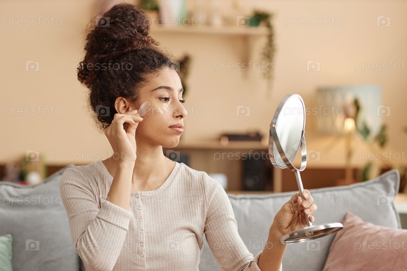 Молодая женщина с маской на лице смотрит в зеркало дома
