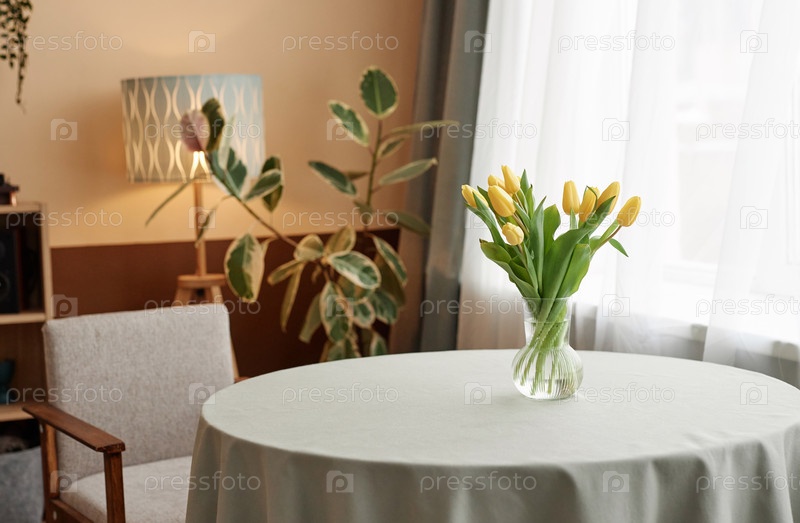 Уютный интерьер комнаты с букетом желтых тюльпанов