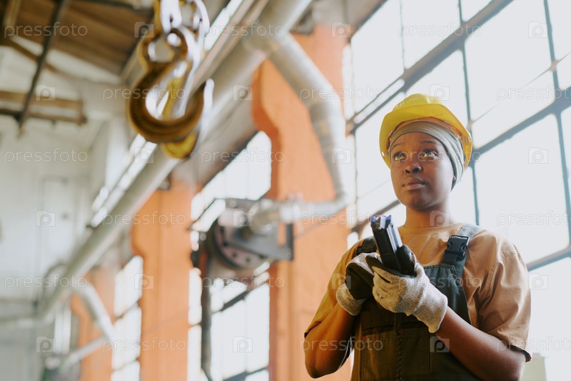 Женщина, использующая подъемное снаряжение на работе в фабрике
