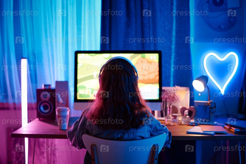Непризнанная девушка играет в геймера на компьютере