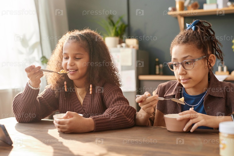 Две чернокожие девушки едят хлопья на завтрак в солнечном свете