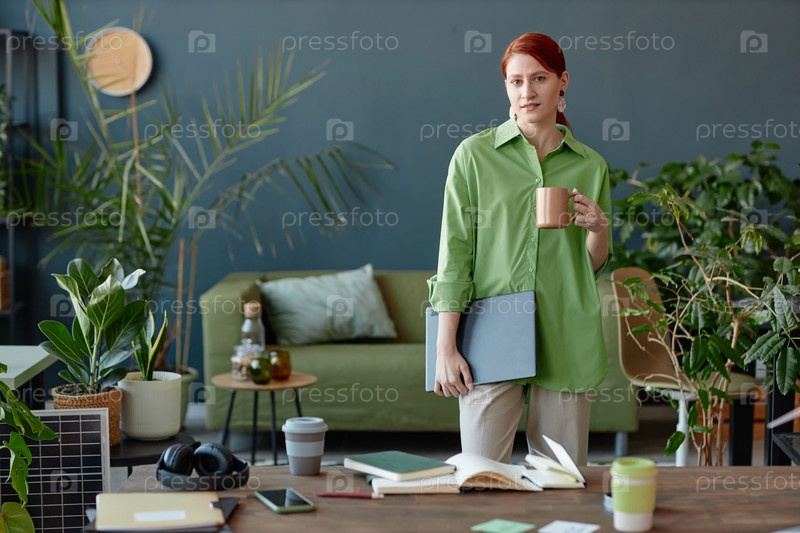 Красноволосая бизнесвуменка в офисе с кофейной кружкой