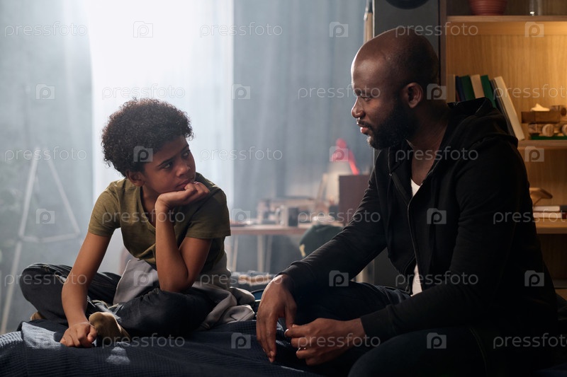 Родитель разговаривает с сыном-подростком, сидящим на кровати и делящимся