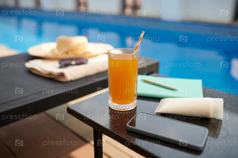 Фруктовый сок, смартфон и солнцезащитный крем на столе у бассейна