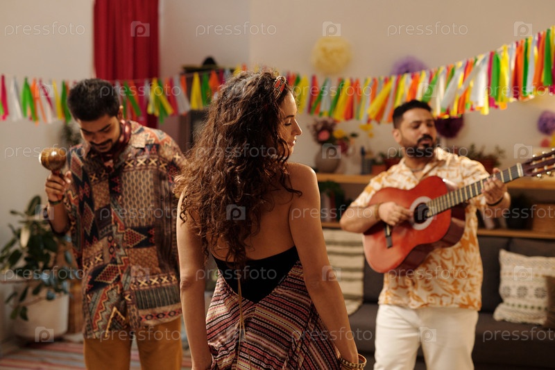 Молодая женщина танцует перед двумя мужчинами