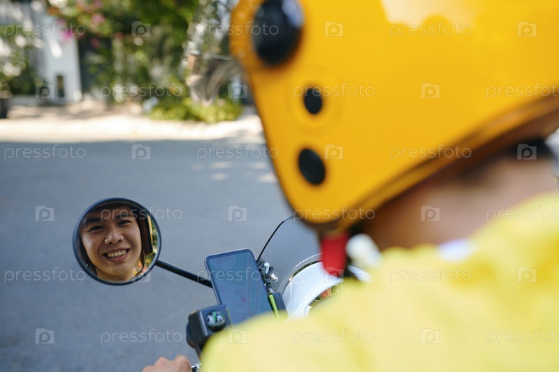 Водитель мотоцикла смотрит в выпуклое зеркало