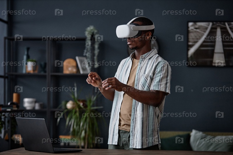 Человек в гарнитуре VR, стоящий в гостиной