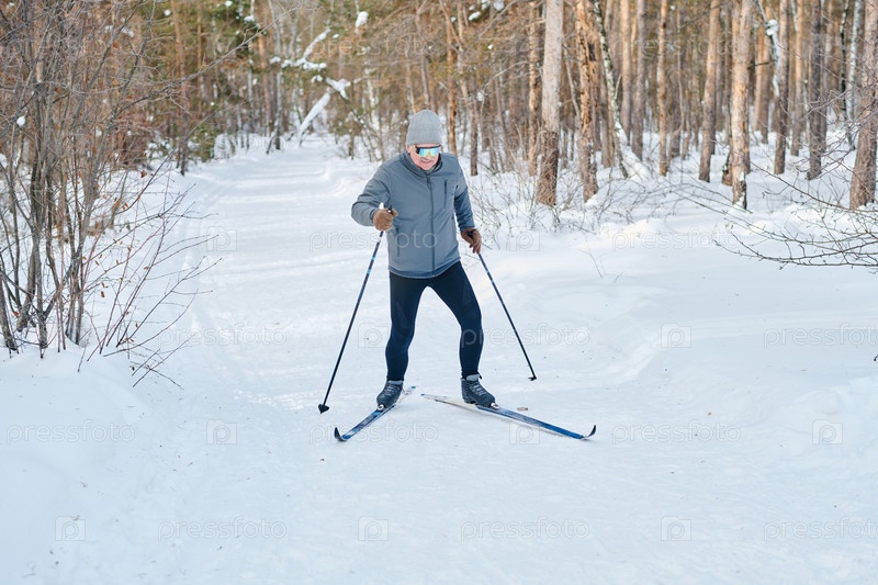 Пожилой мужчина в спортивной одежде лыжное катание
