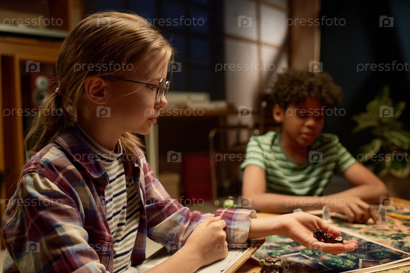 Серьезная девушка бросает кости на игровой доске