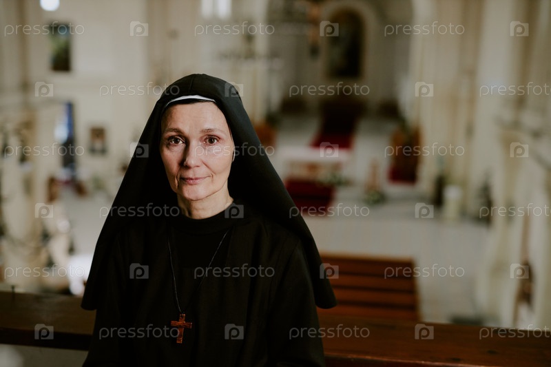Зрелая монахиня смотрит на камеру