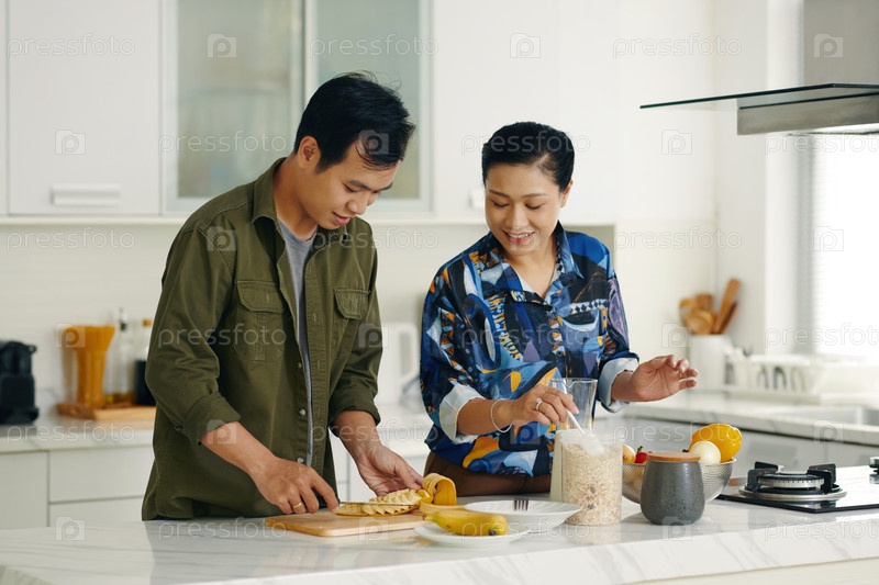 Пара готовит завтрак вместе дома