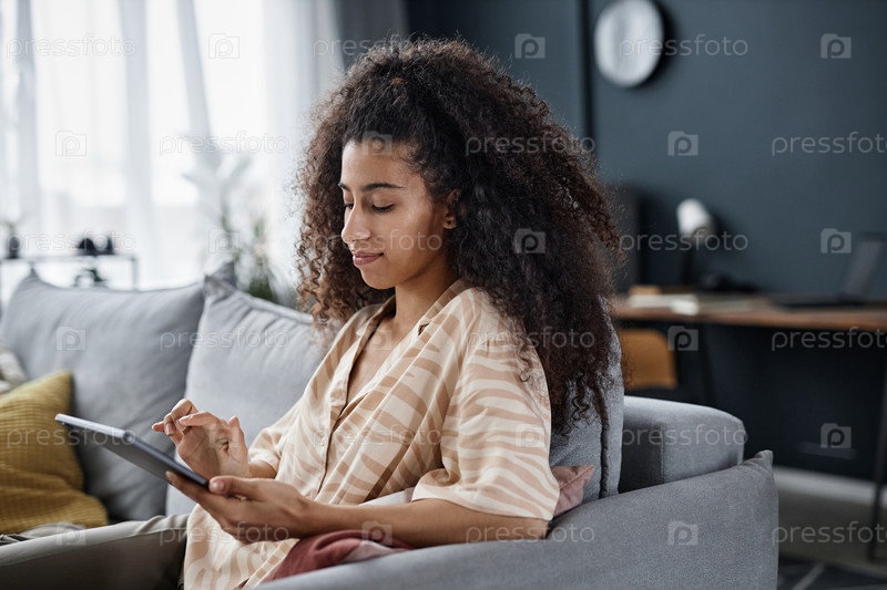 Молодая женщина серфирует в Интернете на цифровом планшете