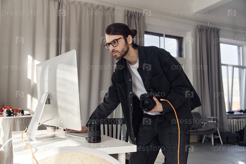 Фотограф, использующий компьютер в белой фотостудии
