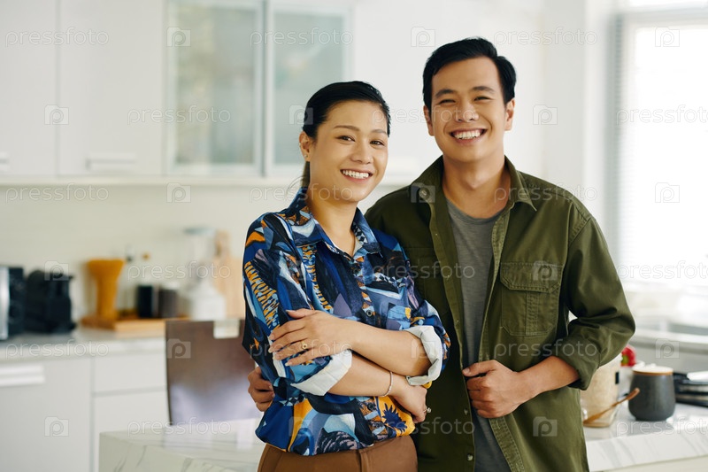 Счастливая пара, стоящая на кухне