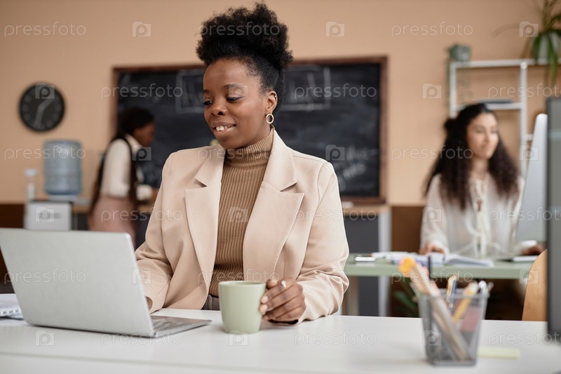 Улыбающаяся чернокожая женщина использует ноутбук в офисе с доской