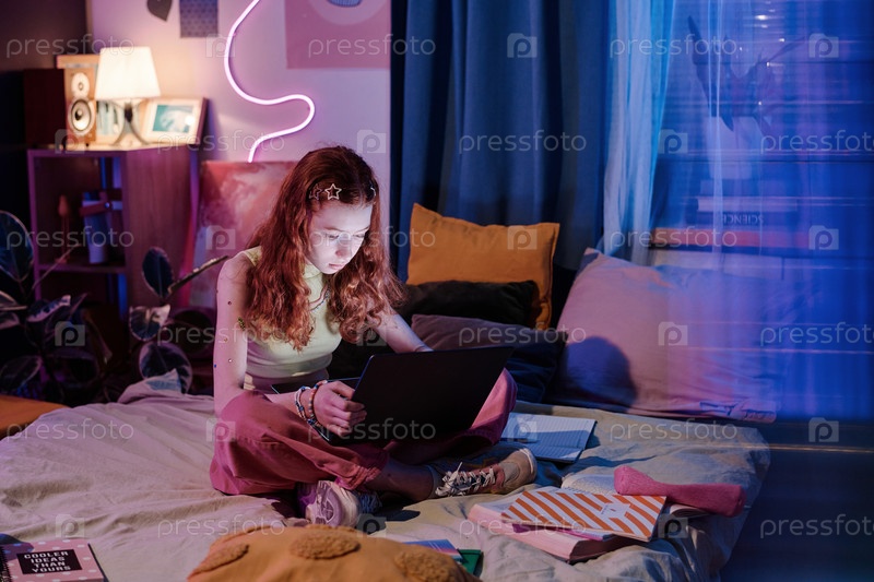 Девушка, использующая ноутбук поздно вечером