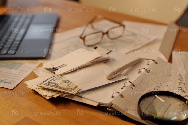 Ручка, квитанции и конверт с долларами