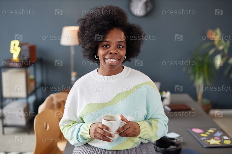 Улыбающаяся чернокожая женщина с естественными кудрявыми волосами в офисе