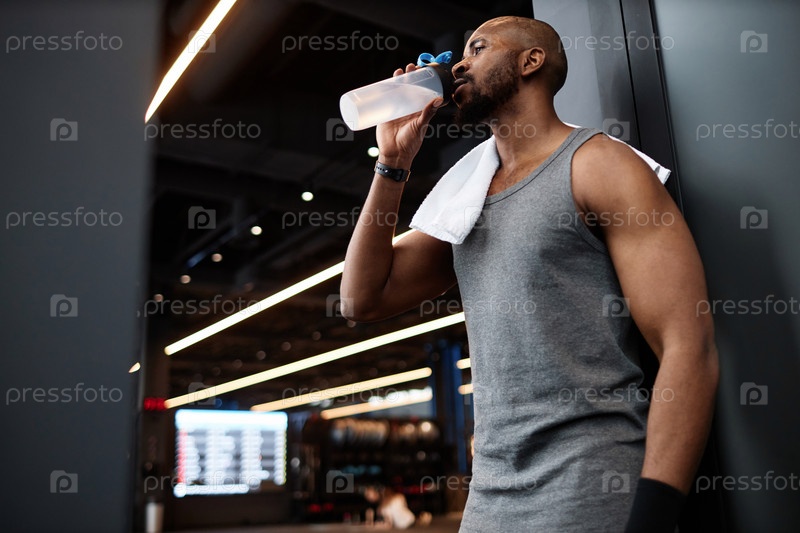 Мускульный чернокожий мужчина пьет воду в спортзале