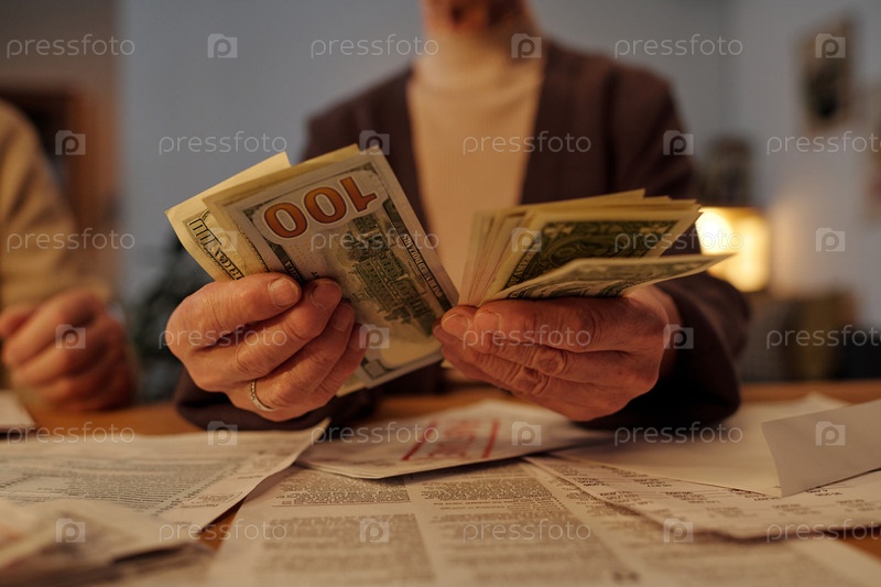 Пожилая женщина считает доллары за столом