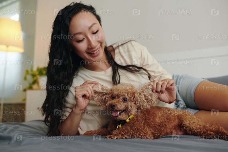 Женщина, играющая ушами собаки