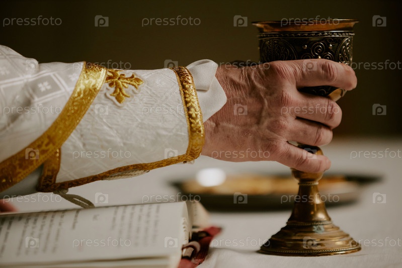 Непризнанный священник, держащий чашку вина в руке