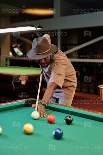 Чернокожий мужчина в шляпе и играет в бассейн за бильярдным столом