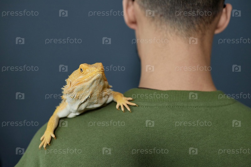 Человек с домашним питомцем игуаны на заднем плане