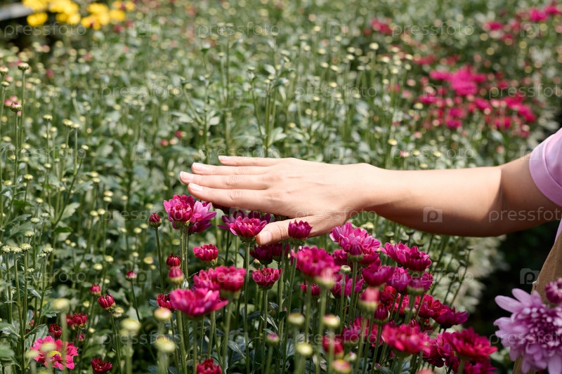 Рука, касающаяся цветов в солнечном свете