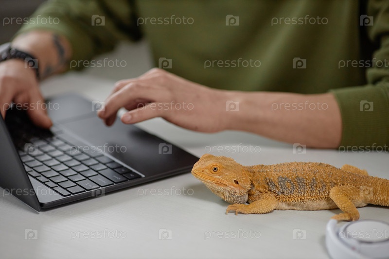 Игуана сидит на столе с мужчиной, использующим ноутбук