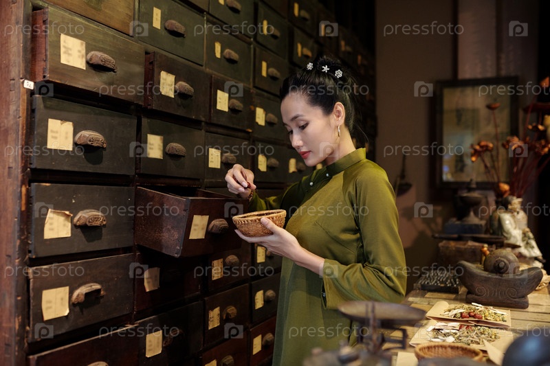Аптекарий вынимает травы из ящика