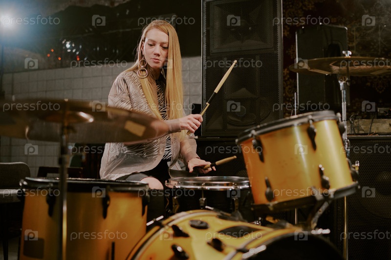 Молодая женщина играет на барабанах